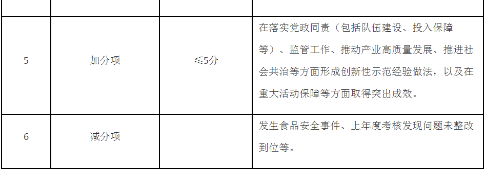 第五條 考核內容主要包括食品安全基礎工作推進、年度重點工作落實、食品安全狀況等,同時設置即時性工作評價和加減分項(考核內容要點見附件)。具體考核指標及分值在年度食品安全工作考核方案及其細則中明確,設置要科學合理,可操作、可評價、可區(qū)分,切實減輕基層負擔。