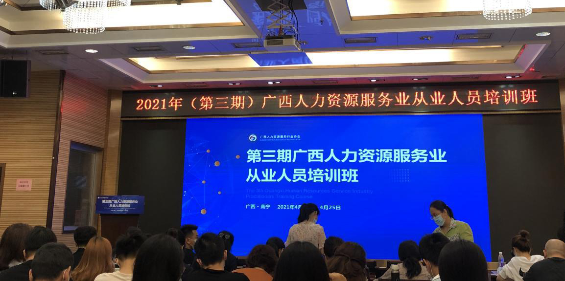 ????????2021年(第三期)廣西人力資源服務(wù)業(yè)從業(yè)人員培訓(xùn)班近日在南寧舉辦,各市企事業(yè)單位從事人力資源工作人員,以及全區(qū)各類人力資源服務(wù)機構(gòu)從業(yè)人員參加培訓(xùn),益嘉人資公司派一人參加。