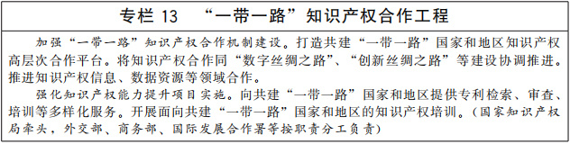加強(qiáng)知識產(chǎn)權(quán)國際合作機(jī)制建設(shè)。鞏固和完善“一帶一路”知識產(chǎn)權(quán)合作,充分利用“一帶一路”知識產(chǎn)權(quán)合作平臺,擴(kuò)大合作項(xiàng)目規(guī)模和儲備。深度參與金磚國家、中美歐日韓、中日韓、中國—東盟等小多邊知識產(chǎn)權(quán)合作,加強(qiáng)與各方政策和業(yè)務(wù)規(guī)則交流,支持產(chǎn)業(yè)界積極參與相關(guān)合作機(jī)制。完善跨境司法協(xié)作安排,加強(qiáng)防范打擊侵犯知識產(chǎn)權(quán)犯罪國際合作。(中央宣傳部、最高人民法院、最高人民檢察院、外交部、公安部、商務(wù)部、海關(guān)總署、國家知識產(chǎn)權(quán)局等按職責(zé)分工負(fù)責(zé))