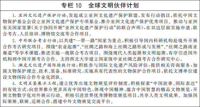 編制并實(shí)施“十四五”考古工作專項(xiàng)規(guī)劃。系統(tǒng)確定考古發(fā)掘重點(diǎn),深化中華文明探源工程,推進(jìn)“考古中國(guó)”重大項(xiàng)目,科學(xué)闡釋中國(guó)境內(nèi)人類起源、文明起源、中華文明形成、統(tǒng)一多民族國(guó)家建立和發(fā)展、中華文明在世界文明史中的重要地位等關(guān)鍵問題,揭示中華文明的歷史文化價(jià)值和核心特質(zhì)。