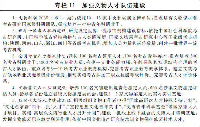 培育一批以領(lǐng)軍人才和中青年骨干創(chuàng)新人才為重點(diǎn)的高層次文物人才,加強(qiáng)考古、科技創(chuàng)新、文物鑒定、文物修復(fù)、文物展覽等急需領(lǐng)域人才培養(yǎng),加快建設(shè)一支門類齊全、技藝精湛的文物技能人才隊(duì)伍,穩(wěn)步造就一支科技研發(fā)能力和技術(shù)應(yīng)用能力過硬的文物科技人才隊(duì)伍,錘煉一支熟悉專業(yè)、素質(zhì)優(yōu)良的文物管理人才隊(duì)伍。加強(qiáng)相關(guān)行業(yè)文物保護(hù)人才培養(yǎng)。