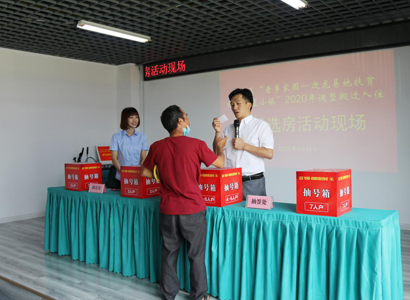 6月14日,右江區(qū)“老鄉(xiāng)家園—迎龍易地扶貧搬遷安置小鎮(zhèn)”2020年調(diào)整搬遷入住工作拉開了序幕。當(dāng)日上午,符合本次新調(diào)入搬遷對象的搬遷戶在益眾公司老鄉(xiāng)家園(益眾.尚城商業(yè)樓B1棟)辦公區(qū)舉行現(xiàn)場抽號選房、簽約手續(xù)。