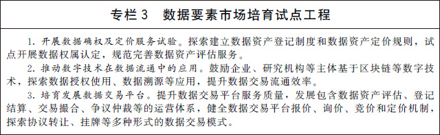 (二)加快數(shù)據(jù)要素市場化流通。加快構(gòu)建數(shù)據(jù)要素市場規(guī)則,培育市場主體、完善治理體系,促進(jìn)數(shù)據(jù)要素市場流通。鼓勵市場主體探索數(shù)據(jù)資產(chǎn)定價機制,推動形成數(shù)據(jù)資產(chǎn)目錄,逐步完善數(shù)據(jù)定價體系。規(guī)范數(shù)據(jù)交易管理,培育規(guī)范的數(shù)據(jù)交易平臺和市場主體,建立健全數(shù)據(jù)資產(chǎn)評估、登記結(jié)算、交易撮合、爭議仲裁等市場運營體系,提升數(shù)據(jù)交易效率。嚴(yán)厲打擊數(shù)據(jù)黑市交易,營造安全有序的市場環(huán)境。