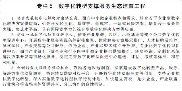 (四)培育轉(zhuǎn)型支撐服務(wù)生態(tài)。建立市場化服務(wù)與公共服務(wù)雙輪驅(qū)動,技術(shù)、資本、人才、數(shù)據(jù)等多要素支撐的數(shù)字化轉(zhuǎn)型服務(wù)生態(tài),解決企業(yè)“不會轉(zhuǎn)”“不能轉(zhuǎn)”“不敢轉(zhuǎn)”的難題。面向重點行業(yè)和企業(yè)轉(zhuǎn)型需求,培育推廣一批數(shù)字化解決方案。聚焦轉(zhuǎn)型咨詢、標(biāo)準(zhǔn)制定、測試評估等方向,培育一批第三方專業(yè)化服務(wù)機構(gòu),提升數(shù)字化轉(zhuǎn)型服務(wù)市場規(guī)模和活力。支持高校、龍頭企業(yè)、行業(yè)協(xié)會等加強協(xié)同,建設(shè)綜合測試驗證環(huán)境,加強產(chǎn)業(yè)共性解決方案供給。建設(shè)數(shù)字化轉(zhuǎn)型促進(jìn)中心,銜接集聚各類資源條件,提供數(shù)字化轉(zhuǎn)型公共服務(wù),打造區(qū)域產(chǎn)業(yè)數(shù)字化創(chuàng)新綜合體,帶動傳統(tǒng)產(chǎn)業(yè)數(shù)字化轉(zhuǎn)型。