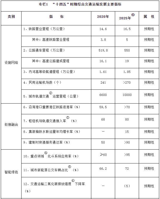 注:①〔〕內(nèi)為5年累計數(shù)。②指納入國家批準(zhǔn)的城市軌道交通建設(shè)規(guī)劃中的大中運量城市軌道交通項目。③指國際樞紐機(jī)場和區(qū)域樞紐機(jī)場中連通軌道交通的機(jī)場數(shù)量占比。④指重點營運車輛、郵政快遞自有干線運輸車輛、應(yīng)安裝具備衛(wèi)星定位功能船載設(shè)備的客船及危險品船等。⑤指新能源公交車輛占所有地面公交車輛的比重。⑥指按單位運輸周轉(zhuǎn)量計算的二氧化碳排放。
