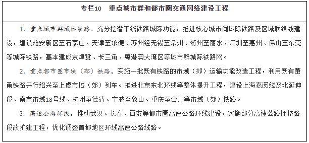 強(qiáng)化重點城市群城際交通建設(shè)。圍繞京津冀、長三角、粵港澳大灣區(qū)、成渝、長江中游等城市群,以軌道交通、高速公路為骨干,提升城際運輸通道功能,加強(qiáng)核心城市快速直連,構(gòu)建多節(jié)點、網(wǎng)絡(luò)化的城際交通網(wǎng),實現(xiàn)城市群內(nèi)主要城市間2小時通達(dá)。整體推進(jìn)京津冀、長三角、粵港澳大灣區(qū)城際鐵路和市域(郊)鐵路建設(shè),有序推動成渝地區(qū)雙城經(jīng)濟(jì)圈城際鐵路和市域(郊)鐵路建設(shè),加強(qiáng)與高速鐵路、普速鐵路一體銜接,擴(kuò)大對5萬人口以上城鎮(zhèn)的有效覆蓋。