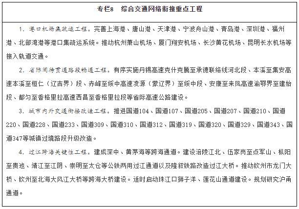 建設(shè)多節(jié)點、網(wǎng)格狀、全覆蓋的京津冀一體化綜合交通網(wǎng)絡(luò),基本建成軌道上的京津冀,高標(biāo)準(zhǔn)、高質(zhì)量打造雄安新區(qū)對外交通網(wǎng)絡(luò),加強(qiáng)北京城市副中心與中心城區(qū)、廊坊北三縣交通基礎(chǔ)設(shè)施互聯(lián)互通,強(qiáng)化北京冬奧會、冬殘奧會交通保障。依托長江黃金水道,整體設(shè)計推進(jìn)長江經(jīng)濟(jì)帶綜合交通運輸體系建設(shè),補(bǔ)強(qiáng)沿江高鐵和鐵路貨運能力,全力打通公路省際待貫通路段,提升江海聯(lián)運、鐵水聯(lián)運發(fā)展水平。推進(jìn)粵港澳大灣區(qū)基礎(chǔ)設(shè)施互聯(lián)互通,優(yōu)化航運和航空資源配置,加強(qiáng)港澳與內(nèi)地的交通聯(lián)系,支持香港提升國際航運、國際航空樞紐地位。推動長三角地區(qū)交通運輸更高質(zhì)量一體化發(fā)展,加快對外交通、城際交通、都市圈交通高效銜接和有機(jī)融合,協(xié)同推進(jìn)港航、海事一體化發(fā)展,推動上海市、江蘇省、浙江省、安徽省共建輻射全球的航運樞紐,加快提升江蘇通州灣江海聯(lián)動示范區(qū)功能,打造長江集裝箱運輸新出??凇?gòu)建海南島內(nèi)暢通、陸島連通、全球通達(dá)的現(xiàn)代綜合交通運輸體系,建設(shè)現(xiàn)代化綜合交通樞紐,穩(wěn)步推進(jìn)自由貿(mào)易港建設(shè)。構(gòu)建黃河流域綠色安全便捷綜合交通網(wǎng)絡(luò),強(qiáng)化跨區(qū)域大通道建設(shè)。