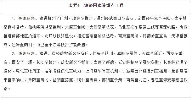 建設(shè)現(xiàn)代化鐵路網(wǎng)。堅持客貨并重、新建改建并舉、高速普速協(xié)調(diào)發(fā)展,加快普速鐵路建設(shè)和既有鐵路擴(kuò)能改造,著力消除干線瓶頸,推進(jìn)既有鐵路運能緊張路段能力補(bǔ)強(qiáng),加快提高中西部地區(qū)鐵路網(wǎng)覆蓋水平。加強(qiáng)資源富集區(qū)、人口相對密集脫貧地區(qū)的開發(fā)性鐵路和支線鐵路建設(shè)。推進(jìn)高速鐵路主通道建設(shè),提升沿江、沿海、呼南、京昆等重要通道以及京滬高鐵輔助通道運輸能力,有序建設(shè)區(qū)域連接線。綜合運用新技術(shù)手段,改革創(chuàng)新經(jīng)營管理模式,提高鐵路網(wǎng)整體運營效率。統(tǒng)籌考慮運輸需求和效益,合理規(guī)劃建設(shè)鐵路項目,嚴(yán)控高速鐵路平行線路建設(shè)。