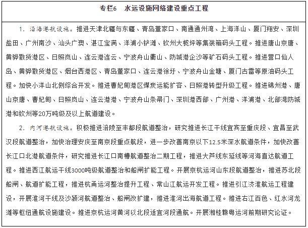 優(yōu)化暢通水運設(shè)施網(wǎng)絡(luò)。建設(shè)京津冀、長三角、粵港澳大灣區(qū)世界級港口群,支持山東打造世界一流的海洋港口,推進(jìn)東北地區(qū)沿海港口一體化發(fā)展,優(yōu)化港口功能布局,推動資源整合和共享共用。有序推進(jìn)沿海港口專業(yè)化碼頭及進(jìn)出港航道等公共設(shè)施建設(shè)。適度超前建設(shè)糧食、能源、礦產(chǎn)資源的接卸、儲存、中轉(zhuǎn)設(shè)施,推進(jìn)沿海沿江液化天然氣碼頭規(guī)劃建設(shè)。提升內(nèi)河港口專業(yè)化、規(guī)?;?,合理集中布局集裝箱、煤炭、鐵礦石、商品汽車等專業(yè)化碼頭。加強(qiáng)內(nèi)河高等級航道擴(kuò)能升級與暢通攻堅建設(shè),完善長江、珠江、京杭運河和淮河等水系內(nèi)河高等級航道網(wǎng)絡(luò),進(jìn)一步提升珠三角高等級航道網(wǎng)出海能力,全面加強(qiáng)長三角、珠江—西江高等級航道網(wǎng)未達(dá)標(biāo)段建設(shè)。推動重要支流航道和庫湖區(qū)航道、內(nèi)河旅游航道、便民碼頭建設(shè)。