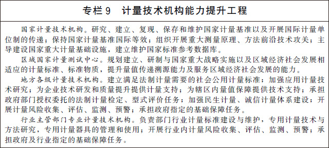 (二十一)加快計(jì)量技術(shù)機(jī)構(gòu)建設(shè)。深化計(jì)量技術(shù)機(jī)構(gòu)改革創(chuàng)新發(fā)展,優(yōu)化整合國(guó)家計(jì)量技術(shù)機(jī)構(gòu)、區(qū)域國(guó)家計(jì)量測(cè)試中心、地方各級(jí)計(jì)量技術(shù)機(jī)構(gòu)和行業(yè)主管部門(mén)專(zhuān)業(yè)計(jì)量技術(shù)機(jī)構(gòu)。大力推動(dòng)國(guó)家計(jì)量技術(shù)機(jī)構(gòu)創(chuàng)新發(fā)展,通過(guò)組織開(kāi)展重大測(cè)量原理、方法前沿技術(shù)攻關(guān),建立量子計(jì)量基準(zhǔn)并保持國(guó)際等效,提供一流的量值溯源和測(cè)量服務(wù),支撐國(guó)家科技創(chuàng)新、工業(yè)競(jìng)爭(zhēng)力提升和經(jīng)濟(jì)社會(huì)發(fā)展。充分發(fā)揮省級(jí)人民政府和行業(yè)主管部門(mén)計(jì)量基礎(chǔ)設(shè)施規(guī)劃建設(shè)自主權(quán),加強(qiáng)普惠性、基礎(chǔ)性和公益性計(jì)量基礎(chǔ)設(shè)施建設(shè)。提升計(jì)量技術(shù)機(jī)構(gòu)服務(wù)市場(chǎng)的能力和水平,推動(dòng)形成一批專(zhuān)業(yè)領(lǐng)域服務(wù)平臺(tái),培育一批專(zhuān)業(yè)化、社會(huì)化、網(wǎng)絡(luò)化的服務(wù)機(jī)構(gòu),為經(jīng)濟(jì)社會(huì)發(fā)展和行業(yè)創(chuàng)新提供計(jì)量測(cè)試服務(wù)。