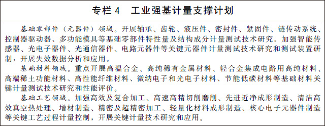 (九)支撐先進(jìn)制造與質(zhì)量提升。實(shí)施制造業(yè)計(jì)量能力提升工程,建立一批先進(jìn)制造業(yè)發(fā)展急需的高準(zhǔn)確度、高穩(wěn)定性計(jì)量基準(zhǔn)、標(biāo)準(zhǔn)。在戰(zhàn)略性新興產(chǎn)業(yè)和現(xiàn)代服務(wù)業(yè)等領(lǐng)域,建設(shè)一批國(guó)家產(chǎn)業(yè)計(jì)量測(cè)試中心和聯(lián)盟,搭建計(jì)量公共服務(wù)平臺(tái),聚焦制造業(yè)領(lǐng)域測(cè)不了、測(cè)不全、測(cè)不準(zhǔn)難題,加強(qiáng)關(guān)鍵計(jì)量測(cè)試技術(shù)、測(cè)量方法研究和裝備研制,為產(chǎn)業(yè)發(fā)展提供全溯源鏈、全產(chǎn)業(yè)鏈、全壽命周期并具有前瞻性的計(jì)量測(cè)試服務(wù)。開(kāi)展產(chǎn)業(yè)計(jì)量基礎(chǔ)能力提升行動(dòng),實(shí)施工業(yè)強(qiáng)基計(jì)量支撐計(jì)劃,充分發(fā)揮計(jì)量對(duì)基礎(chǔ)零部件(元器件)、基礎(chǔ)材料、基礎(chǔ)工藝的技術(shù)支撐和保障作用。研究建立國(guó)家工業(yè)計(jì)量基礎(chǔ)數(shù)據(jù)庫(kù),加強(qiáng)工業(yè)制造領(lǐng)域計(jì)量檢定、校準(zhǔn)、測(cè)試和檢測(cè)數(shù)據(jù)的采集、管理和應(yīng)用。