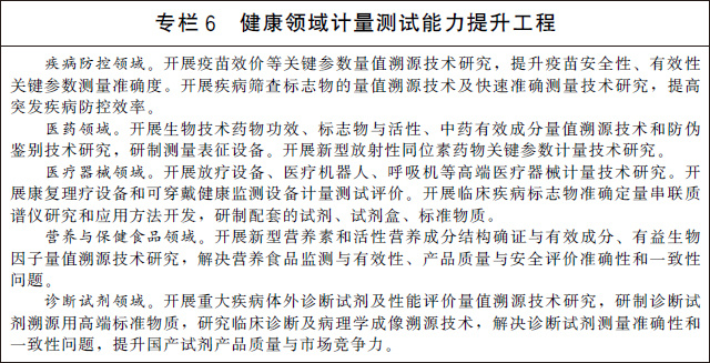 (十五)服務(wù)大眾健康與安全。加快醫(yī)療健康領(lǐng)域計(jì)量服務(wù)體系建設(shè),圍繞疾病防控、生物醫(yī)藥、診斷試劑、高端醫(yī)療器械、康復(fù)理療設(shè)備、可穿戴設(shè)備、營(yíng)養(yǎng)與保健食品等開(kāi)展關(guān)鍵計(jì)量測(cè)試技術(shù)研究和應(yīng)用。加強(qiáng)體育設(shè)施和器材計(jì)量技術(shù)研究和測(cè)試服務(wù),促進(jìn)體育產(chǎn)業(yè)高質(zhì)量發(fā)展。完善地質(zhì)和海洋災(zāi)害、地震、洪澇干旱、森林草原火災(zāi)等自然災(zāi)害防御的計(jì)量保障體系,提高防災(zāi)、減災(zāi)、救災(zāi)計(jì)量能力。加強(qiáng)危險(xiǎn)化學(xué)品、礦山、建筑施工、地質(zhì)勘查等安全生產(chǎn)相關(guān)計(jì)量器具的研制生產(chǎn)和監(jiān)督管理。加強(qiáng)公共安全領(lǐng)域計(jì)量服務(wù)體系建設(shè),開(kāi)展交通安全、社會(huì)穩(wěn)定和安全等領(lǐng)域關(guān)鍵計(jì)量測(cè)試技術(shù)研究和應(yīng)用,推進(jìn)交通監(jiān)管設(shè)備、警用裝備、刑事技術(shù)產(chǎn)品等計(jì)量測(cè)試基礎(chǔ)設(shè)施建設(shè)。