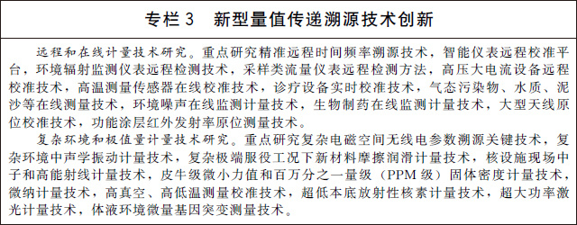 (六)開(kāi)展新型量值傳遞溯源技術(shù)研究。針對(duì)復(fù)雜環(huán)境、實(shí)時(shí)工況環(huán)境和極端環(huán)境的計(jì)量需求,研究新型量值傳遞溯源方法,解決綜合參量的準(zhǔn)確測(cè)量難題。建立扁平化場(chǎng)景高適應(yīng)性的量值溯源體系。研究數(shù)字化模擬測(cè)量、工業(yè)物聯(lián)、跨尺度測(cè)量、復(fù)雜系統(tǒng)綜合計(jì)量等關(guān)鍵技術(shù)。加強(qiáng)國(guó)家標(biāo)準(zhǔn)物質(zhì)在制備、定值、保存、溯源評(píng)價(jià)及量值傳遞應(yīng)用新模式等方面的全壽命周期、系統(tǒng)性研究與評(píng)價(jià)。加快推進(jìn)計(jì)量基準(zhǔn)、計(jì)量標(biāo)準(zhǔn)及標(biāo)準(zhǔn)物質(zhì)智能化、網(wǎng)絡(luò)化技術(shù)的研究和應(yīng)用。