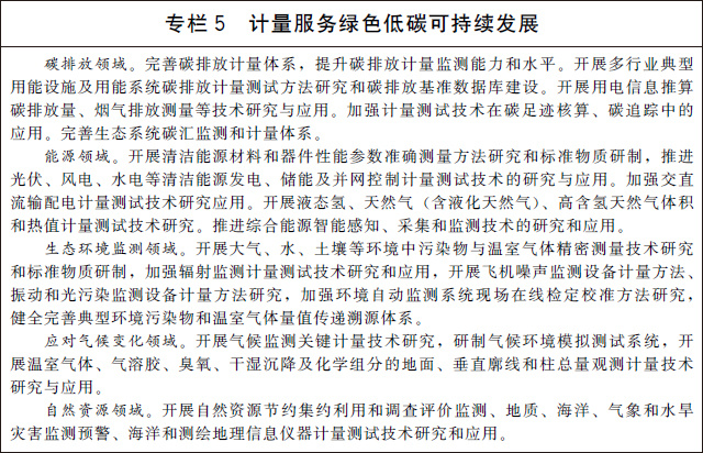 (十四)支撐碳達(dá)峰碳中和目標(biāo)實(shí)現(xiàn)。完善溫室氣體排放計(jì)量監(jiān)測(cè)體系,加強(qiáng)碳排放關(guān)鍵計(jì)量測(cè)試技術(shù)研究和應(yīng)用,健全碳計(jì)量標(biāo)準(zhǔn)裝置,為溫室氣體排放可測(cè)量、可報(bào)告、可核查提供計(jì)量支撐。建立碳排放計(jì)量審查制度,強(qiáng)化重點(diǎn)排放單位的碳計(jì)量要求。在城市和園區(qū)開(kāi)展低碳計(jì)量試點(diǎn)。建立完善資源環(huán)境計(jì)量體系,建設(shè)一批國(guó)家能源、水文水資源和環(huán)境計(jì)量中心,推進(jìn)能耗、水資源、環(huán)境監(jiān)測(cè)系統(tǒng)建設(shè),加強(qiáng)能源資源和環(huán)境計(jì)量數(shù)據(jù)分析挖掘和利用。加快推進(jìn)能源資源計(jì)量服務(wù)示范工程建設(shè),引導(dǎo)和培育能源資源和環(huán)境計(jì)量服務(wù)市場(chǎng)。