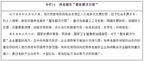 各?。ㄗ灾螀^(qū)、直轄市)要根據(jù)人口老齡化發(fā)展形勢,制定實施專項規(guī)劃,加強與相關(guān)規(guī)劃銜接。各級老齡工作委員會要發(fā)揮統(tǒng)籌協(xié)調(diào)作用,推動老齡工作委員會各成員單位履職盡責(zé),形成工作合力。發(fā)揮養(yǎng)老服務(wù)聯(lián)席會議制度作用,推進養(yǎng)老服務(wù)體系建設(shè),強化區(qū)域養(yǎng)老服務(wù)資源統(tǒng)籌管理。支持城市群、都市圈打造養(yǎng)老服務(wù)體系一體化建設(shè)格局,形成服務(wù)能力銜接、產(chǎn)業(yè)發(fā)展協(xié)同的合作區(qū)域。支持大型城市和區(qū)域中心城市推動養(yǎng)老產(chǎn)業(yè)集聚發(fā)展,充分發(fā)揮輻射帶動和示范作用。推動以地級行政區(qū)為單位制定“整體解決方案”,將老齡事業(yè)發(fā)展和養(yǎng)老服務(wù)體系建設(shè)納入經(jīng)濟社會發(fā)展全局中通盤考慮,全方位整合資源力量,充分調(diào)動各方積極性,推動兜底性、普惠型、多樣化三種路徑協(xié)同發(fā)展。